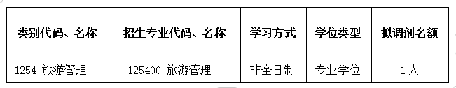 根据调剂考生报考情况,经学校研究决定,将国际商务专业(专业代码:025400)的1个非全日制招生指标调整至旅游管理专业的非全日制招生指标(专业代码:125400):