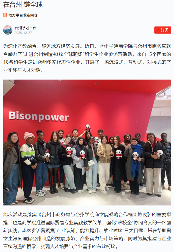 为深化产教融合,服务地方经济发展。近日,台州学院商学院与台州市商务局联合举办了“走进台州制造·链接全球职场”留学生企业参访营活动。来自15个国家的18名留学生走进台州多家代表性企业,开展了一场沉浸式、互动式、对接式的产业实践与人才对话。