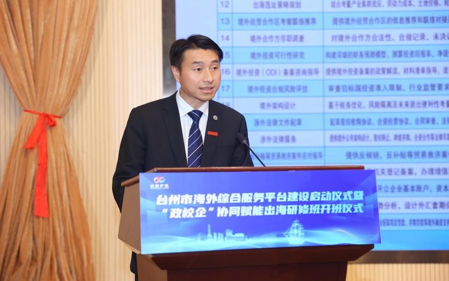 董官真在致辞中指出,台州作为全国开放发展前沿城市,全市累计对外投资中方备案额已超63亿美元,备案境外企业和机构近1000家,企业“走出去”基础扎实、成效显著。启动建设台州市海外综合服务平台,构建覆盖更广、响应更快、服务更优的海外综合服务体系,让台州企业“走出去”步伐更稳、底气更足。他提出三点希望:一是希望平台成为企业“出海”的“护航舰”。服务企业是平台的生命线。要精准对接企业需求,集成政策资源,引入专业力量,让企业在“出海”路上少走弯路、不踩红线。二是希望平台成为产教融合的“试验田”。人才是“出海”的关键支撑。政府政策与市场趋势要同向发力,让高校才智与企业需求精准匹配,真正实现“课堂连着市场、专业贴着产业”。三是希望平台成为协同赋能的“强磁场”。