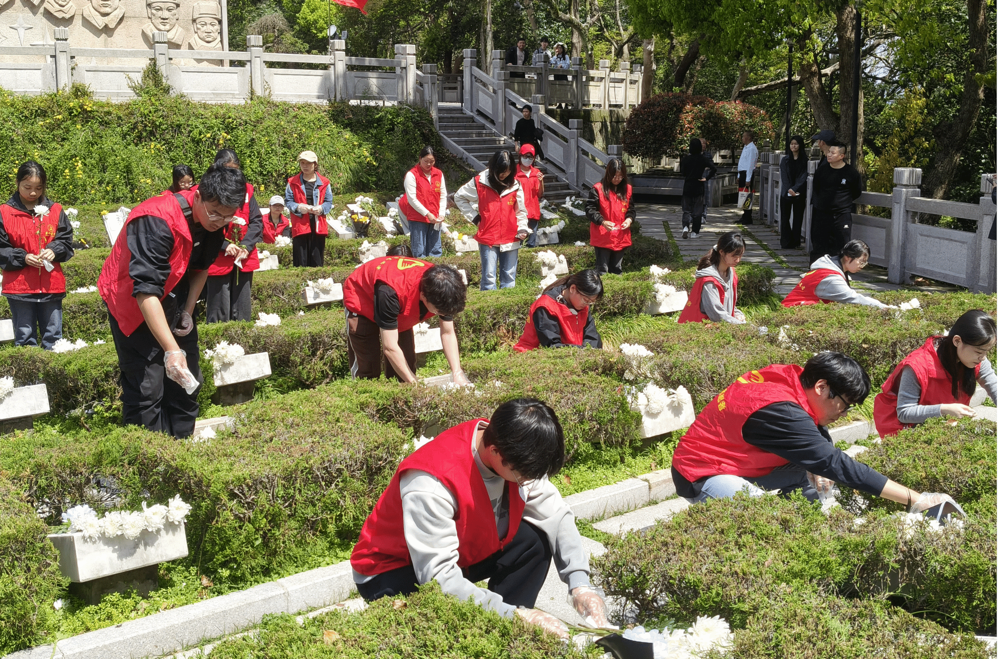 仪式结束后,志愿者们前往墓园开展祭扫志愿服务,认真清扫陵园内的落叶杂物、轻拭墓碑上的尘土,并为烈士献上白菊,以朴素的行动表达对英烈的崇高敬意。活动最后,志愿者们来到烈士碑前,在活动横幅上郑重签下自己的名字,并集体合影留念,为本次志愿服务画上圆满句号。