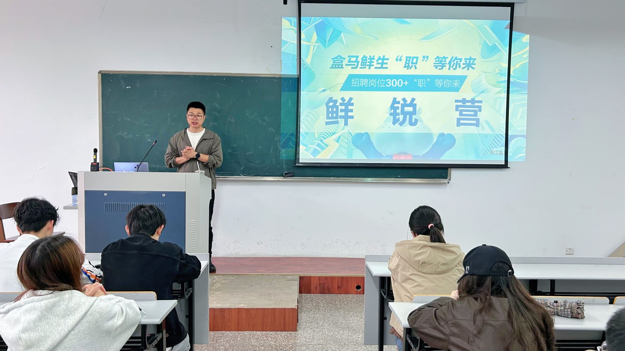 宣讲会上,HR颜磊首先介绍了盒马的发展规模与核心业务。盒马作为新零售标杆企业,在全国布局多家门店,行业营收位居前列。依托浙江优质水产资源,盒马打造了高端水产供应链,并采用双轨运营模式,持续推进产品创新与销售拓展。为了让同学们更直观地了解业务特点,水产专员张聪围绕水产领域的产品特性与销售优势进行了详细讲解,并结合实际案例展示了盒马在生鲜领域的核心竞争力。宣讲过程中,同学们积极提问,现场互动热烈。