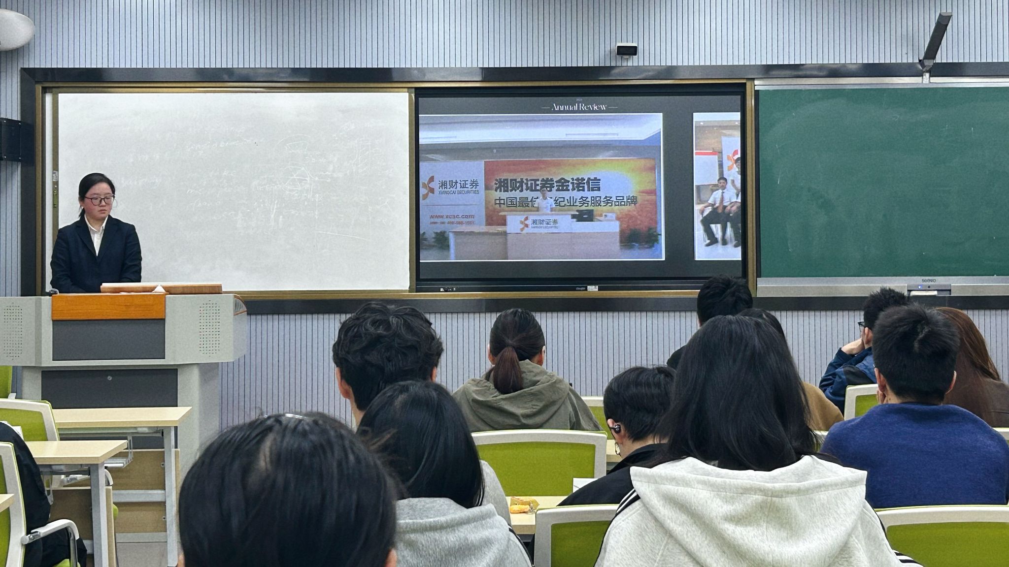 为充分发挥学生党支部在就业工作中的引领作用,帮助学生拓展职业认知、深入了解证券行业,4月21日,商学院学生第四党支部承办“职引未来”高质量就业活动第七十四期,在4-102教室举行优秀校友证券从业经验分享会,吸引40余位金融专业学生代表参加。活动特邀21金融学校友、湘财证券中心大道营业部理财经理陈晨担任主讲嘉宾,围绕应届求职面试、证券从业人员日常工作及相关从业证书考取等核心内容展开全面分享,为学弟学妹们答疑解惑。