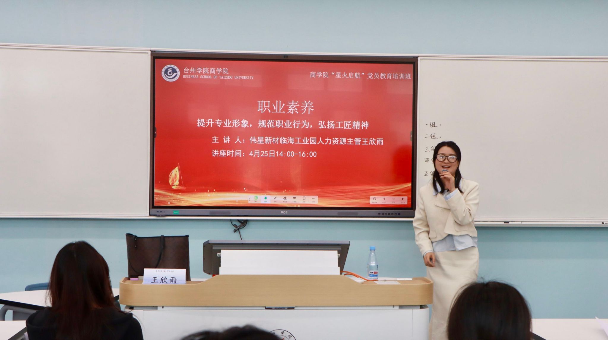 为进一步加强入党申请人思想教育,提升学生职业素养与商务礼仪水平,商学院于4月25日开展商学院“星火启航”党员教育培训班之职业素养讲座。本次讲座特邀伟星新材人力资源部经理王欣雨授课,学院组织员吴佳妲、2026年上半年全体入党申请人参加了本次活动。
