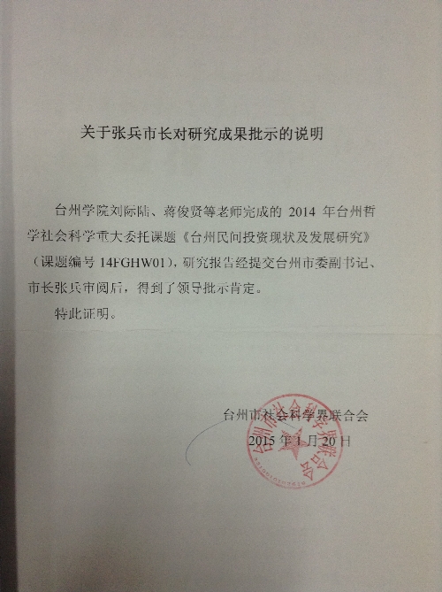 我校经贸管理学院刘际陆博士、蒋俊贤博士等完成的2014年台州哲学社科规划重大委托课题《台州民间投资发展研究》(课题编号:14FGHW01),研究成果经台州市社科联第113期《社科要报》提交台州市委副书记、市长张兵审阅后,得到了重要肯定,并作出了“市社科联这份研究数据详实,揭示了不少问题,也提出了不少有价值的意见和建议。请发改委、研究室等相关部门负责同志阅研”的亲笔批示。