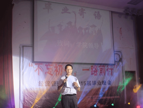 晚会在毕业生自发为毕业季献礼而精心拍摄,感人肺腑的微电影《Fly》中拉开序幕。随后经贸管理学院院长杜才平寄语毕业生们,希望2015届全体毕业生,胸怀鸿浩之志,身负使命责任,心怀大学精神,步入社会后做一个感恩、向善的好人;希望同学们珍惜师生情谊,珍惜同窗友谊,继续关心与支持母校的发展。院长的临别赠言博得了全场的热烈掌声,谆谆教诲铭记于心。