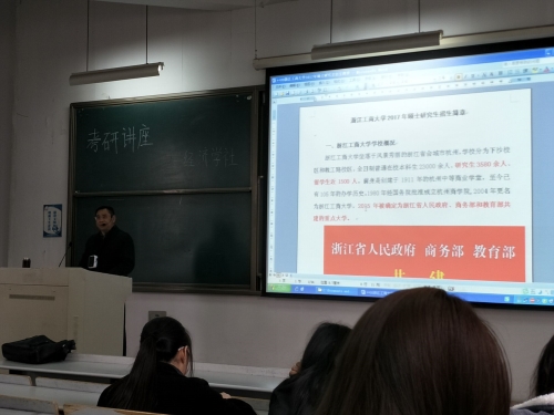 讲座上,谢汪送教授以浙江工商大学2017年硕士研究生招生简章为例,为同学普及考研知识。讲座主要围绕考研的重要性、考研的学习方法、考研报名的注意事项等几个方面展开,对适合经贸学生报考的几个专业进行了重点介绍,对几个相近专业的差别做了详细的对比说明。谢教授还为同学们展示了往年考研学长学姐的经验,鼓励更多的同学通过考研扩宽未来职业生涯、人生规划的发展之路。生动的真人真事,是身边榜样的力量,给大家留下了深刻的印象。讲座后,谢教授还特意留出时间对有考研疑问的同学进行指导,同学们收获满满。