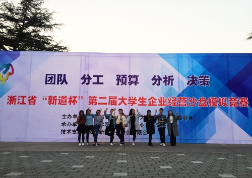 2017年10月20日~22日,浙江省“新道杯”第二届大学生企业经营沙盘模拟竞赛本科组竞赛在嘉兴学院举行,来自省内44所高校的120支队伍参加比赛。我校经贸管理学院财务管理2014级的张群博、徐文媛、吴慧、潘雪莹、胡美霞、毛爱雅,以及2015级的徐仙雅,2016级的彭梦行和高崇丽九名学生组成的三支队伍在胡嘉将、金雅两位老师的带领下,取得两组一等奖,一组三等奖的好成绩,再创新高。