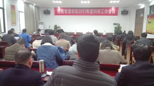 杜才平院长总结了学院2017年科研工作。他肯定了学院2017年科研工作成绩,部分教师的科研能力有所提升,科研队伍的群众基础有所扩大,小微金融研究院科研成果喜人。他分析比较了省内同类高校经管类学科科研实力,指出我们的科研实力偏弱,水平偏低,排名靠后,缺乏重点学科支撑,缺乏强有力的科研团队,学科梯队青黄不接,教师们的科研干劲和动力不足。为此,学院需要积极谋划,进一步激发教师科研工作积极性,努力推进工商管理和应用经济学二大学科建设,继续执行好学院科研提升计划,鼓励教师积极参与全国性学术会议和各类平台的研究工作,加强学科平台与团队建设,重视与政府部门合作,推进区域特色研究,提高课题申报和论文发表的数量和质量。杜院长提到2018年学校可能出台的科研工作考核制度,希望老师们提高对科研工作的紧迫性和责任感的认识,顺势而为,更有作为。