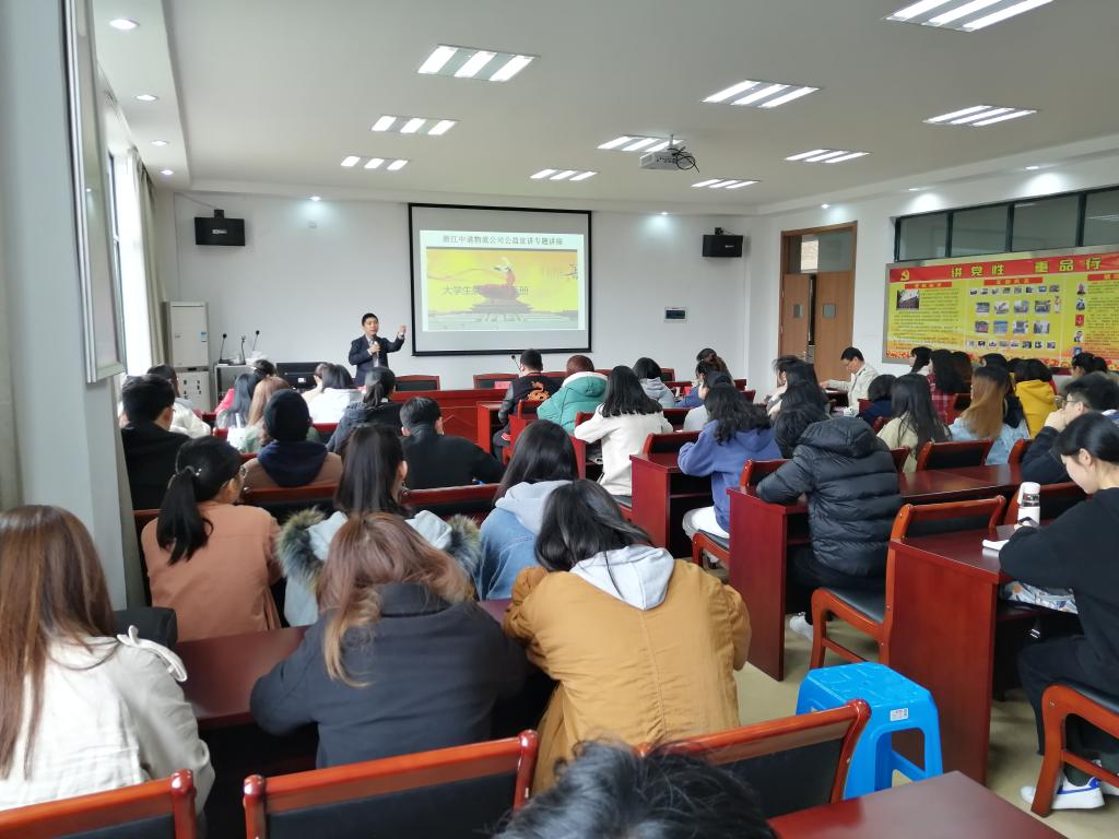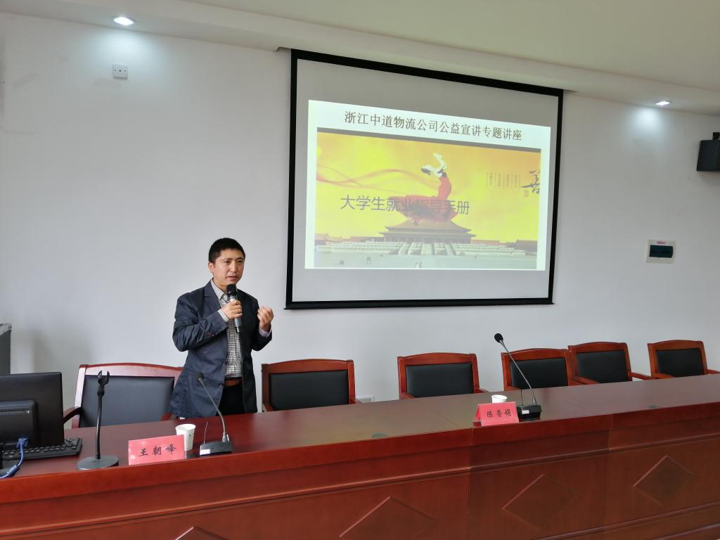 4月4日,商学院邀请浙江中道物流有限公司副总经理王朝峰来校作大学生就业指导讲座,学院院长杜才平主持讲座,国际经济与贸易专业学生参加讲座。