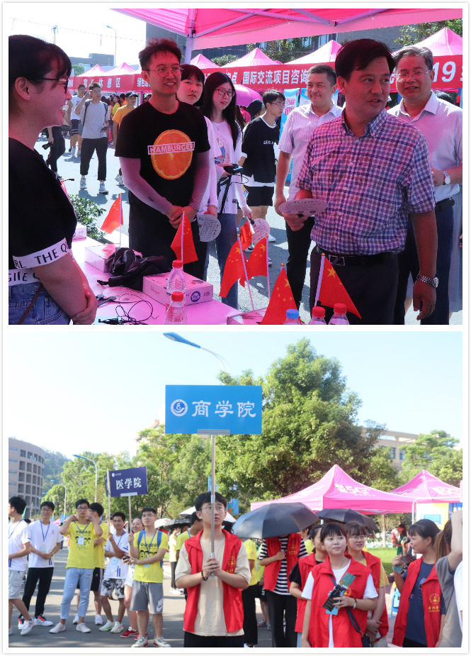 在商学院校园游览导游服务处,17级旅游管理学生许梦梦结合自身所学的专业知识为陈光亭校长作了详细的旅游讲解,得到陈校长的充分肯定与点赞。18级财务管理陈苗苗同学,身残志坚,也作为迎新志愿者来到现场做志愿服务。