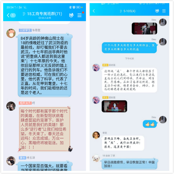 课上,同学们根据专家们上课的内容,边直播边讨论。在班级群、寝室群里,大家有的感叹疫情带来的重大影响,有的感慨祖国、基层党员、医护人员在疫情防控期间的突出表现,民族自豪感强烈。有的同学认真做好学习笔记。他们或记录专家们的所言所闻,或及时记录下自己的所思所悟,让这一堂特殊的思政课更有意义,更加深刻。