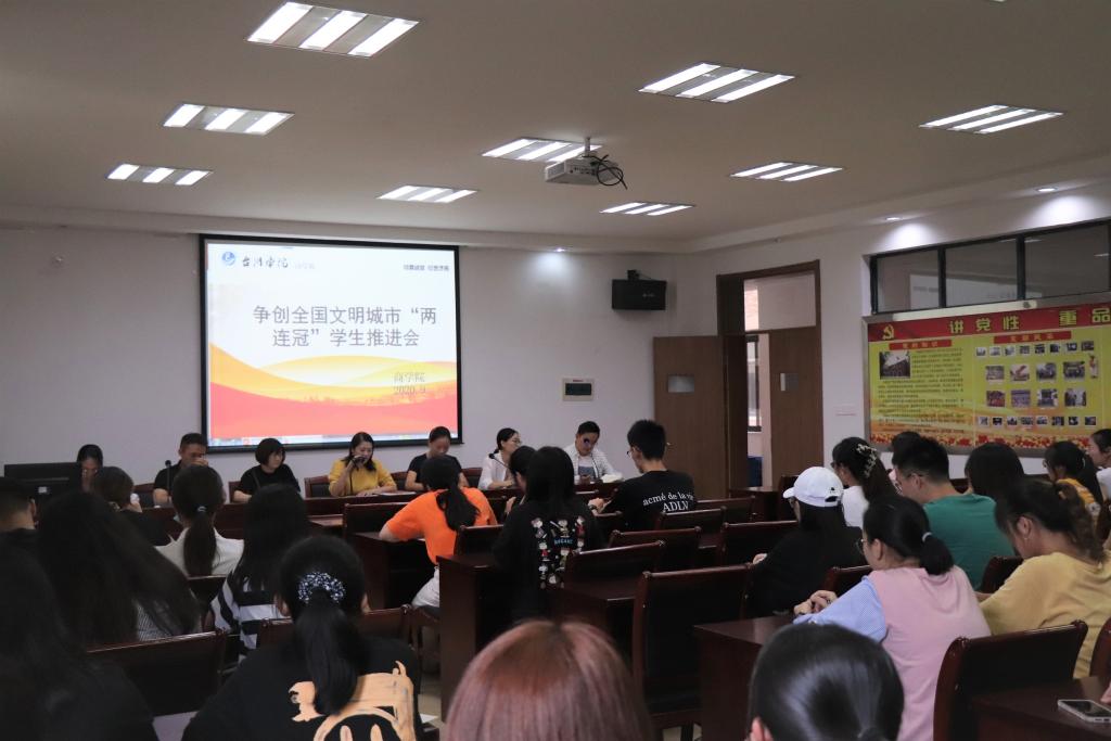 为进一步加强全国文明城市“两连冠”创建工作,同时为扎实推进、落实好新学期学院、学校工作部署会议精神,9月9日下午,商学院召开了争创全国文明城市“两连冠”学生推进会暨学生干部会议。学院党总支副书记鲍婷婷、全体辅导员、各班班长团支书、团学会等学生干部参加了会议。