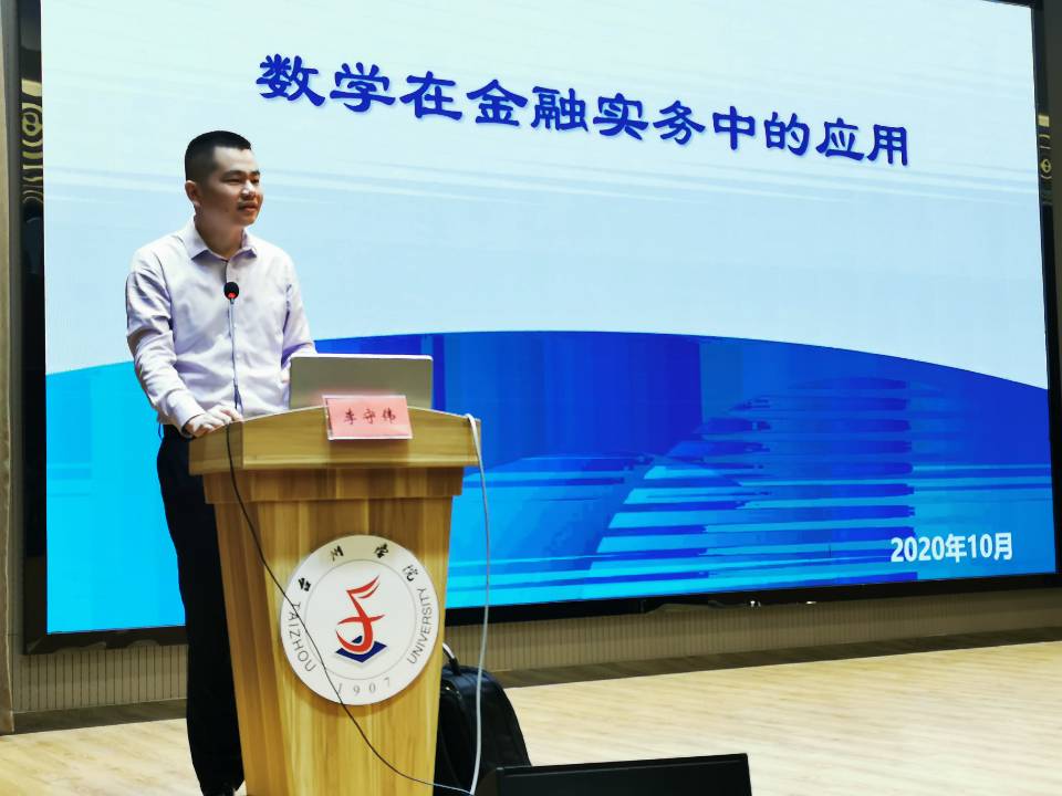 10月10日下午,申万宏源证券风险管理总部总经理助理、证券投资委员会委员李守伟先生为商学院金融学专业全体师生作“数学在金融实务中的应用”学术报告,商学院副院长陈国栋出席报告会。