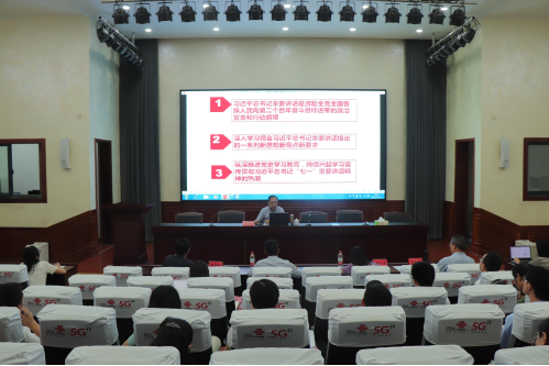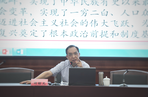 胡韶光副校长从“七一”重要讲话的历史背景和重要意义导入党课,指出习近平总书记“七一”重要讲话立足中国共产党百年华诞的重大时刻和“两个一百年”历史交汇的关键节点,是激励全党全国各族人民向第二个百年奋斗目标进军的政治宣言和行动纲领。他系统而深入地为与座教师讲解了讲话提出的一系列新思想新观点新要求:习近平总书记“七一”重要讲话庄严宣告了第一个百年奋斗目标的成功实现,首次提出了实现中华民族伟大复兴是贯穿中国共产党百年奋斗主题的重要观点,用丰富的史实和翔实的数据集中阐述党百年来创造的“四个伟大成就”和向实际作出的“四个庄严宣告”。胡韶光强调,习近平总书记“七一”重要讲话首次提出的伟大建党精神,充分展现了我党强大的思想、政治、精神和道德优势,要深入学习领会习近平总书记重要讲话精神的丰富内涵和核心要义,深刻领悟以史为鉴、开创未来的“九个必须”,传承优良传统、赓续红色血脉,推动学习往深里走、往心里走、往实里走,将理论学习的收获转化为奋斗前行的不竭动力。