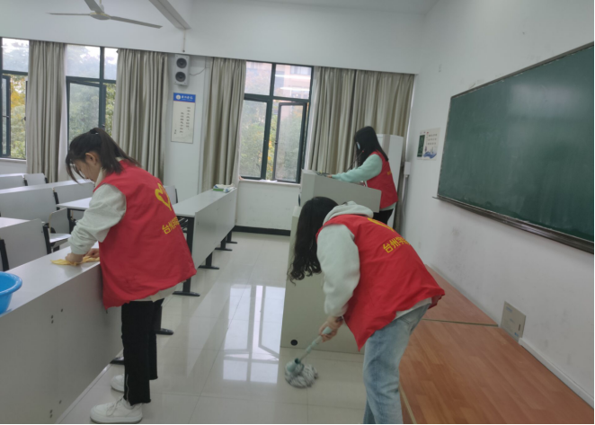 20个志愿者分成五个队伍,带着拖把、扫把、脸盆、抹布等工具对4、5号教学楼的部分教室进行打扫,为师生营造干净整洁的学习环境。各小分队同学分工明确,配合融洽,有的扫地,有的拖地,有的负责擦黑板和清理粉笔槽,有的整理讲台和清理桌面涂鸦,同学们在交流互助中高效地完成了相关工作。能为创建全国文明城市、建设美丽校园出份力,志愿者们都感到非常自豪。