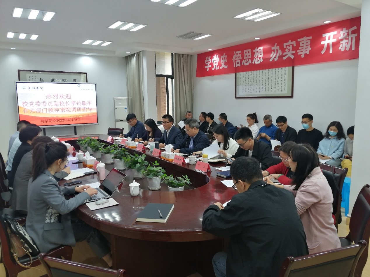 4月28日下午,校党委委员、副校长李钧敏在校研究室主任周良奎、教务处处长金凌虹、国际交流与合作处处长施安全、教务处副处长李银丹陪同下,调研商学院应用型人才培养工作。商学院院长段文奇主持调研会并汇报工作,学院党委书记周全宝、副书记鲍婷婷,学院副院长尹兰香、陈国栋、叶永,各系主任、副主任,教务办老师等参加调研会。