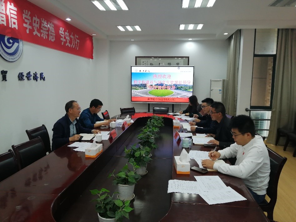 5月12日,校学科建设与研究生管理处处长韩德满、副处长潘志祥调研商学院硕士点培育推进工作,商学院院长段文奇主持调研会并汇报推进工作,副院长叶永,国际商务硕士点、旅游管理硕士点培育有关老师参加调研会。