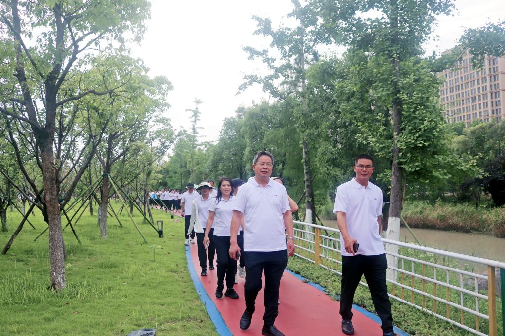 初夏已至,伴着微风,老师们身着统一服装,以商学院西门口为起点,沿着北门小道,踏着欢快的步伐走在校园的健身步道上。在健步走过程中,大家精神饱满,兴致高昂,携手同行,相互交流,共同前进。现场洋溢着崇尚健康、享受快乐的氛围。