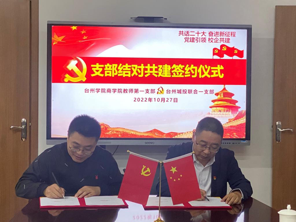 习近平总书记在二十大报告中强调,深入推进新时代党的建设新的伟大工程,同时强调,团结就是力量,团结才能胜利。为进一步落实新时代党的建设总要求,实现校企共建双方资源共享、深度联合,充分发挥社会力量在提升高校党建工作质量中的作用,积极引导和鼓励教师党员走向社会、职工党员走进高校,有效互动提升共建双方党员的幸福感和获得感,10月27日下午,商学院教师第一支部与台州城投联合一支部党建共建签约仪式在商学院三楼会议室举行。