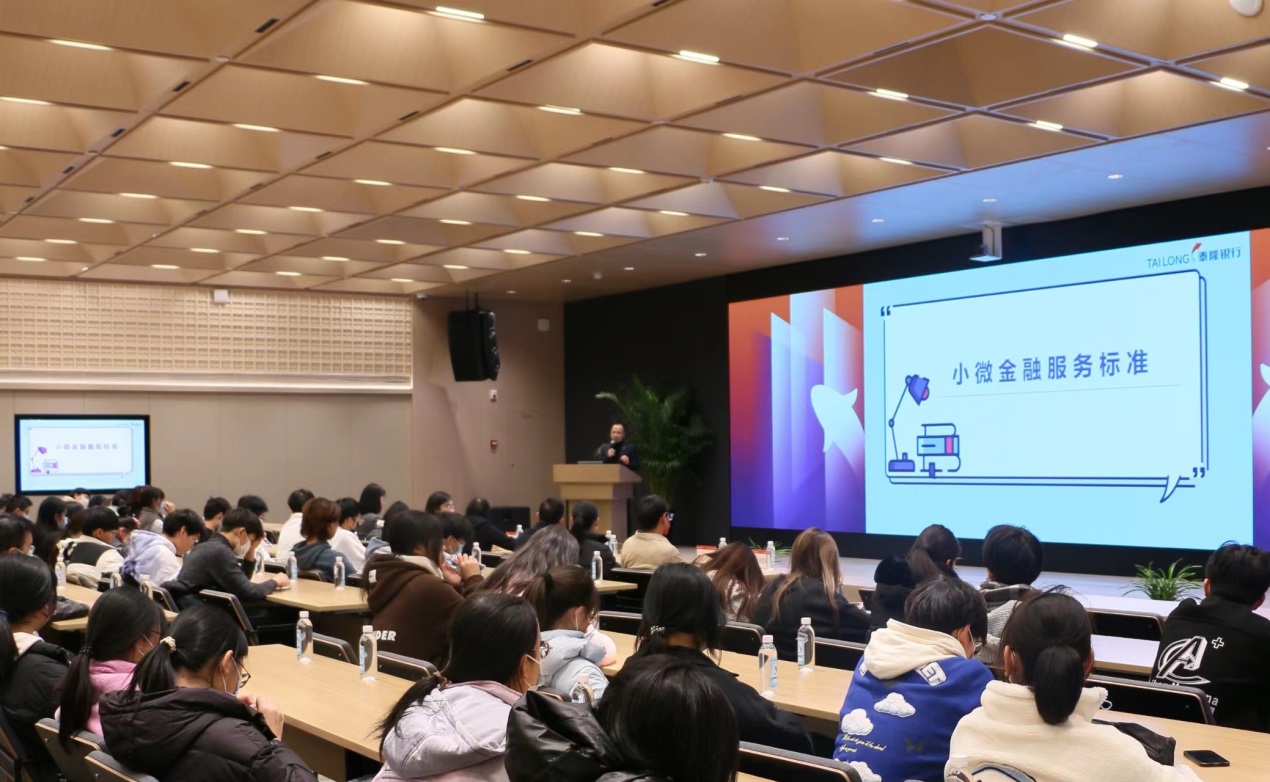 随后,师生在会议室聆听了泰隆银行台州分行副行长傅振关于小微金融服务标准的专题讲座,并参加了台州学院大学生就业基地授牌仪式。