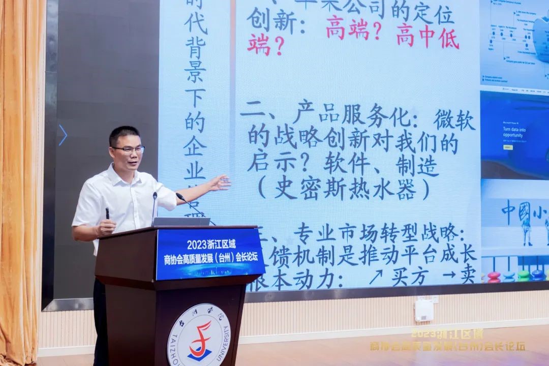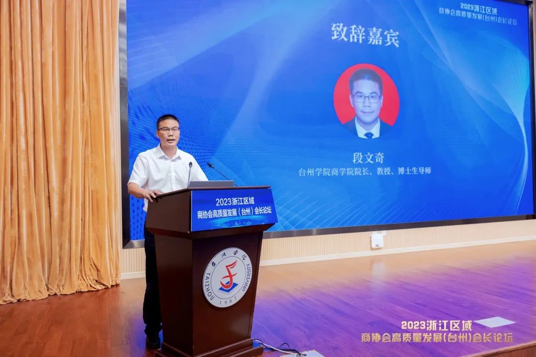 段文奇在论坛上致辞。他代表台州学院商学院向远道而来的各位嘉宾表示诚挚的欢迎和感谢,简要介绍了台州民营经济贡献和台州学院及台州学院商学院概况。他希望台州学院商学院以本次论坛为契机,以“会”为媒、以“会”结友,进一步做足服务地方社会经济高质量发展文章,讲好“中国式现代化”故事,走好“产学研创新路”。