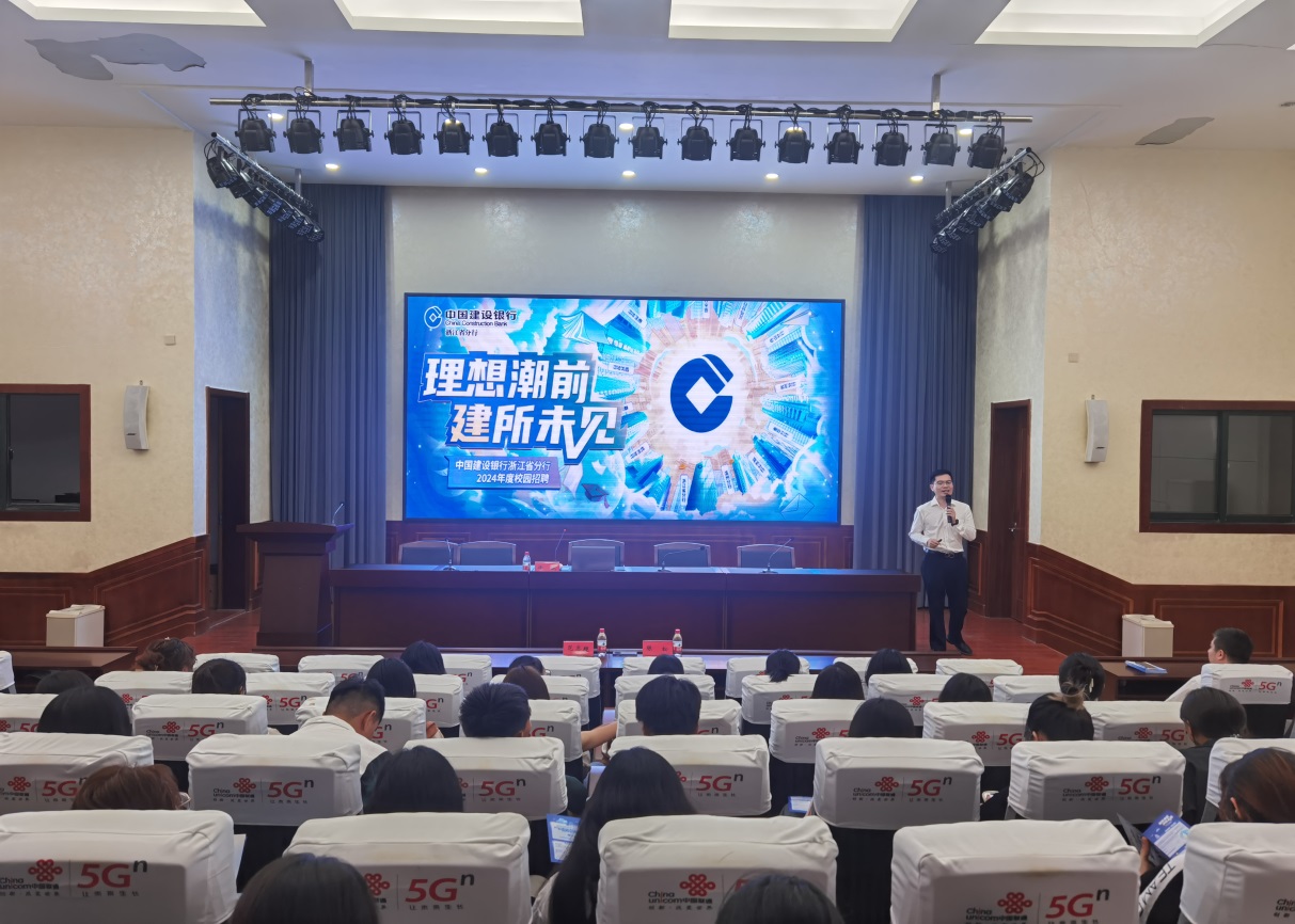 为进一步丰富学生的职场认知,提高学生的求职应聘能力,10月10日,商学院“职引未来”系列讲座第六讲特邀中国建设银行台州分行部门副总经理徐威一行为学生作2024年度校园招聘宣讲。