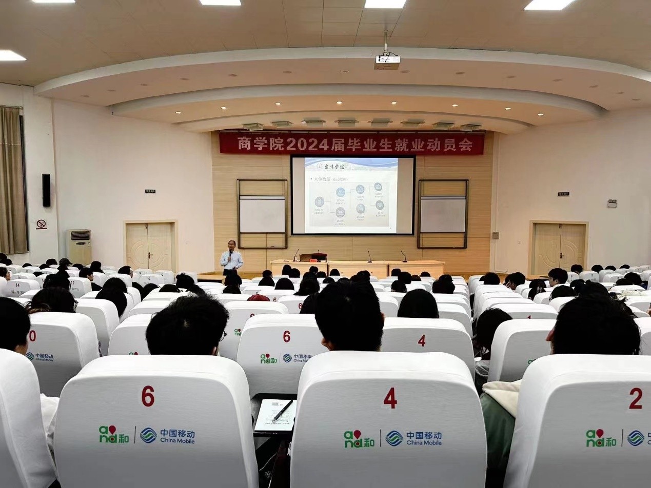 为扎实推进2024届毕业生就业工作,引导学生积极就业,10月18日,商学院在学术报告厅举行2024届毕业生就业动员会暨“职引未来”宏志助航就业能力提升训练营开营仪式。商学院党委书记马斌作主题讲座,商学院党委副书记陈斌岚、全体辅导员、全体2024届毕业生参加会议。