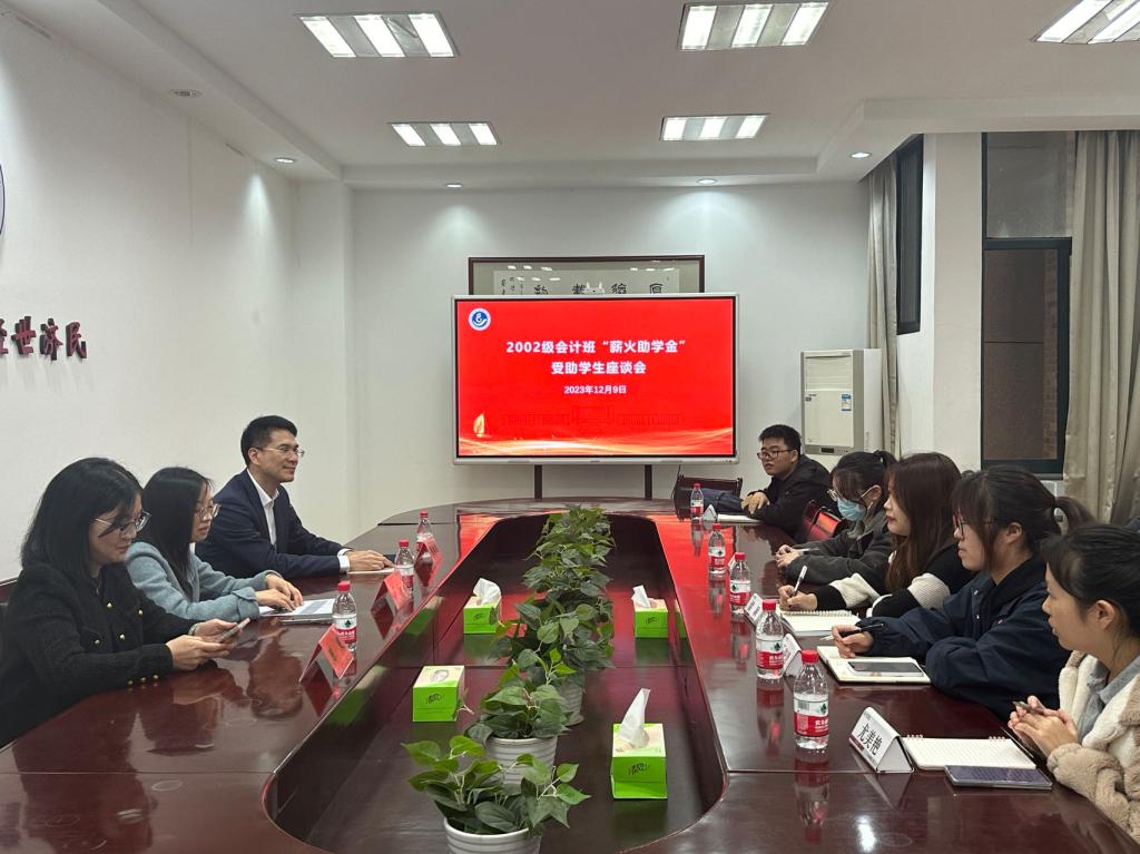 在2002级会计班“薪火助学金”受助学生座谈会中,校友代表冯贻昌、陈笑与受资助学生面对面交谈。学生们表达了由衷的感谢,向校友讲述了自己在学业方面的成绩,包括考取初级会计证书、通过四六级英语考试等,并希望未来也能传承朋辈间友好互助的精神,帮助更多同学。冯贻昌、陈笑表达了对学弟学妹的关心和关爱,鼓励其在兼顾学业的同时,注重多元能力的培养。院党委副书记陈斌岚表示,此次活动畅通了捐赠校友与受助学生的沟通渠道,不仅增强了学生的感恩意识,同时也让校友的爱校情怀薪火相传。