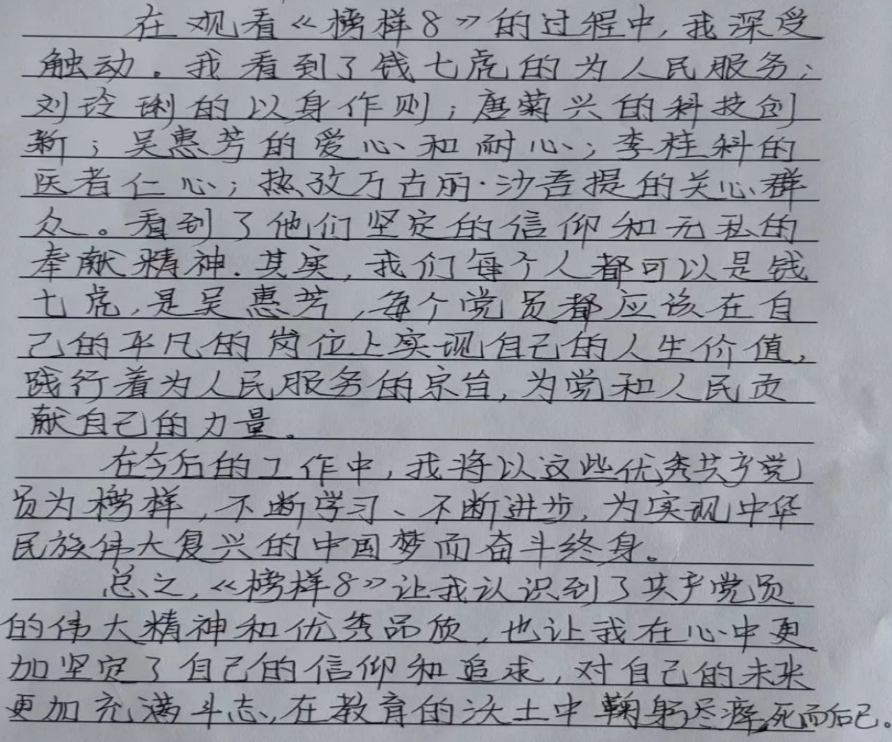 榜样事迹催人奋进,榜样故事鼓舞人心。师生党员们观看节目后深受触动,纷纷表示其实我们每个人都可以是钱七虎,是吴慧芳,每个党员都应该在自己平凡的岗位上实现自己的人生价值,践行着为人民服务的宗旨,为党和人民贡献自己的力量。在今后的工作中,我们更将以这些优秀共产党员为榜样,不断学习、不断进步,为实现中华民族伟大复兴的中国梦而奋斗终身。