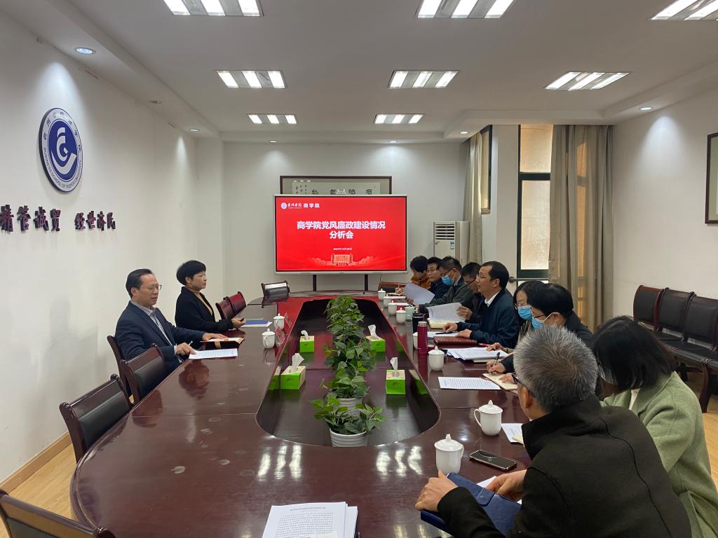马斌代表学院作党风廉政建设分析报告。他围绕廉政风险、意识形态、作风建设、师德师风建设等问题,从四个方面汇报了2023年下半年商学院党风廉政建设的开展情况,深入剖析了存在问题并提出下一步整改措施。随后,学院党政班子分别就分管工作,作党风廉政建设情况汇报,其他参会人员作补充发言。