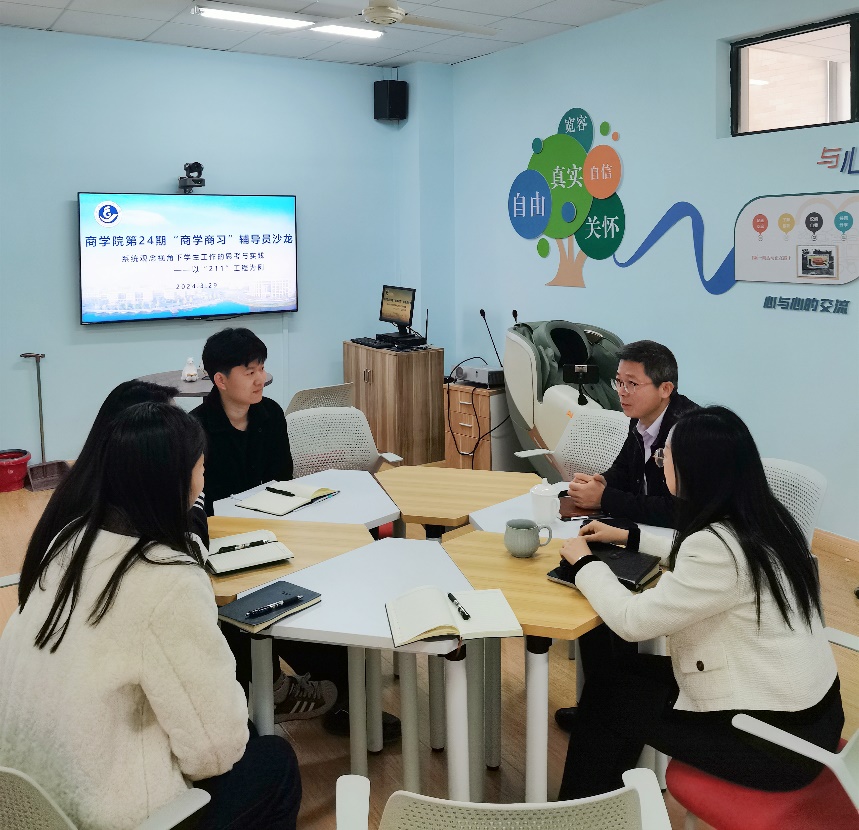 为进一步提升商学院辅导员学生工作的针对性和有效性,3月29日,以“系统观念视角下学生工作的思考与实践”为主题的 “商学商习”辅导员沙龙在商学院307室举行。会议特别邀请了建筑工程学院党委副书记林霖为商学院全体辅导员作经验分享与指导,商学院党委副书记陈斌岚及全体辅导员参加此次会议。