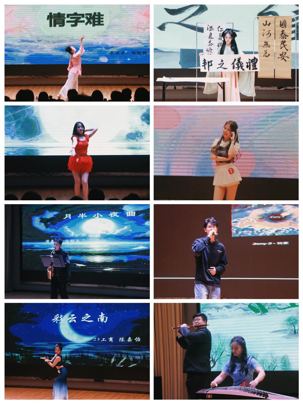 在个人节目展示环节,各选手通过书法、舞蹈、歌曲、古筝、萨克斯等多方形式,将比赛气氛推向高潮。经过激烈的角逐,23环境工程专升本张盼杰摘夺桂冠,22国际经济与贸易张炎炎和22音乐学(师范)莫诗雨分别荣获二、三等奖,22国际经济与贸易唐美爽被评为最佳人气奖。