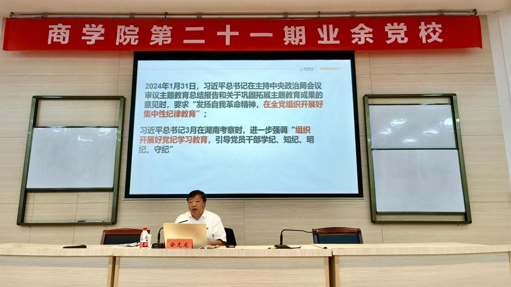 开学典礼后,台州学院原党委副书记金先龙作业余党校第一讲——《中国共产党纪律处分条例》解读。在报告中,金先龙深入解读了《中国共产党纪律处分条例》的修订历程和新增、修改的重点条文。他通过丰富的案例和深刻的分析,让学员们深刻理解了党的纪律教育的重要性和必要性。金先龙强调,党的纪律是党的生命,是全体党员必须遵守的行为准则。他勉励全体学员要认真学纪、准确知纪、自觉明纪、严格守纪,认真学习党的章程,为成为一名合格的中国共产党员而奋斗。