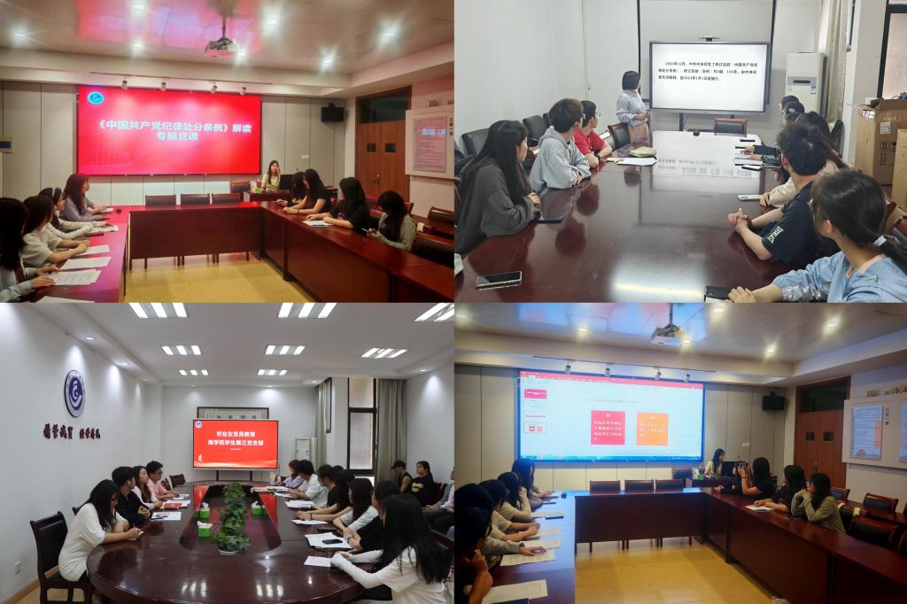 学生党支部召开党员大会,深入学习《中国共产党纪律处分条例》,进一步落实《中国共产党普通高等学校基层组织工作条例》,将毕业生党员管理教育纳入重要议程,提升毕业生党员的党性修养。通过党员大会上的沟通交流,各支部书记及时了解毕业生党员的思想动态与学习生活,为即将走向社会的毕业生党员指引未来道路,明确责任担当。