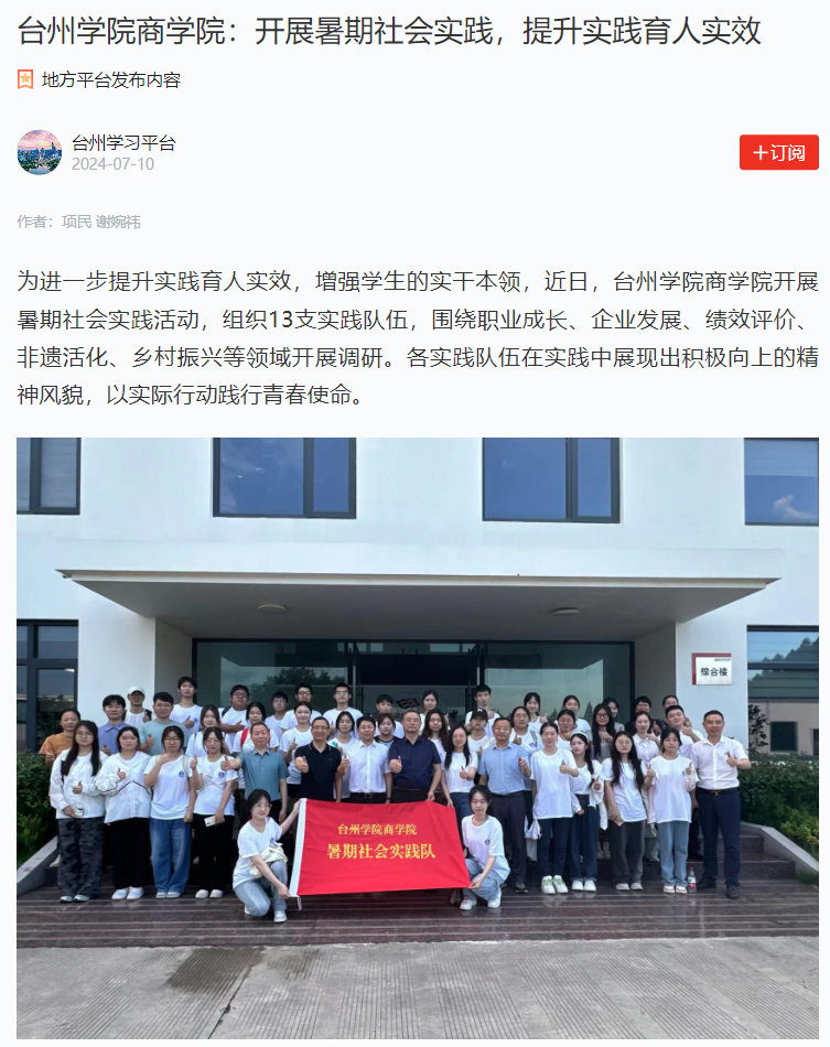 为进一步提升实践育人实效,增强学生的实干本领,近日,台州学院商学院开展暑期社会实践活动,组织13支实践队伍,围绕职业成长、企业发展、绩效评价、非遗活化、乡村振兴等领域开展调研。各实践队伍在实践中展现出积极向上的精神风貌,以实际行动践行青春使命。