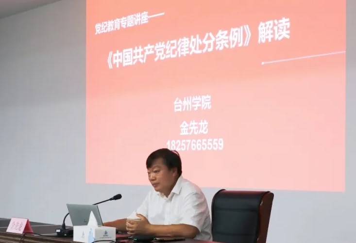 开班典礼结束后,原台州学院党委副书记金先龙作开班第一课《中国共产党纪律处分条例》解读。通过详实的案例深入剖析了《中国共产党纪律处分条例》新增、修改的重点条文,并紧密结合习近平总书记关于全面加强党的纪律建设的重要论述,引导集团干部进一步增强纪律和规矩意识,将党规党纪明记于心、守纪于行,为全体人员上了一堂深刻的党风廉政教育课。