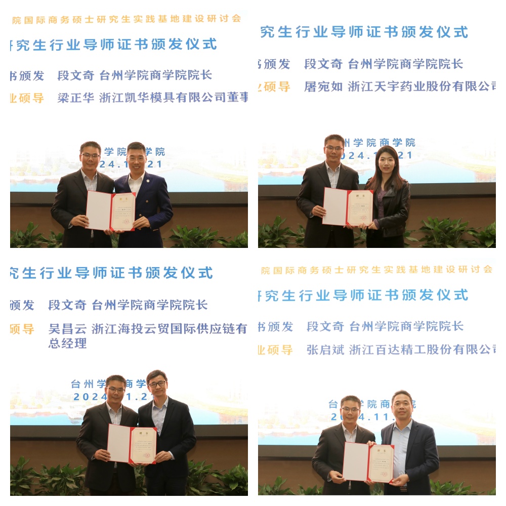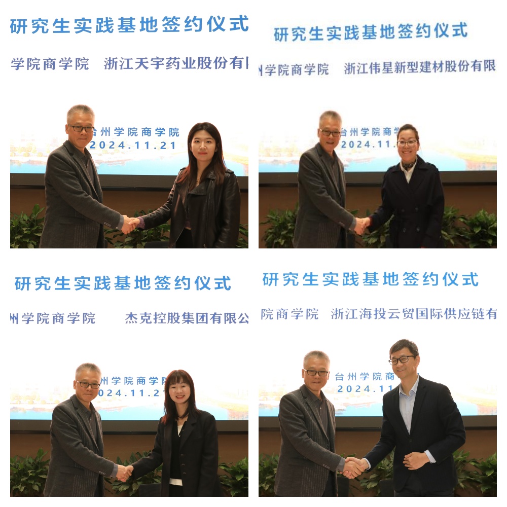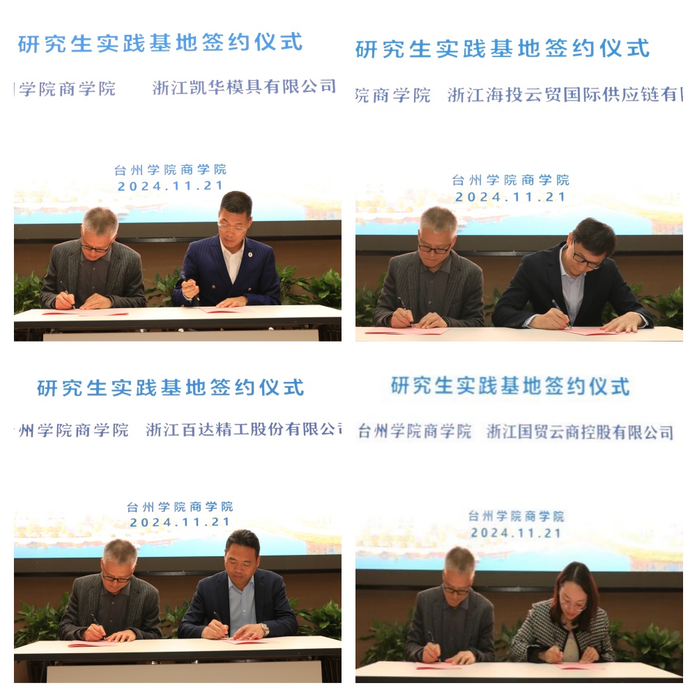 董雪旺副院长与浙江凯华模具有限公司、浙江百达精工、浙江天宇药业、浙江伟星新型建材、杰克控股集团、浙江银轮机械、浙江中非经贸港、浙江海投云贸国际供应链等公司签约国际商务硕士研究生实践基地。