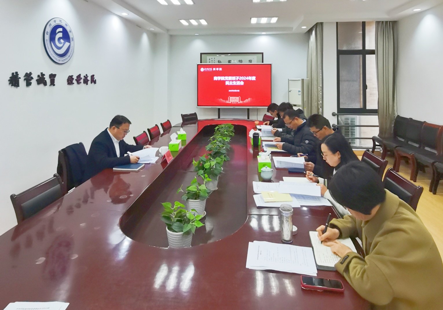 商学院党委高度重视本次民主生活会,会前学院党委理论学习中心组举行专题学习会,重点学习贯彻习近平新时代中国特色社会主义思想和党的二十届三中全会精神,围绕贯彻落实习近平总书记重要讲话重要指示批示精神和考察浙江时提出的“4+1”重要要求,聚焦落实省委“一个首要任务、三个主攻方向、两个根本”工作要求,团结带领学校教职员工,大力弘扬“六干精神”“四千精神”,与会人员分享交流学习体会,为开好此次民主生活会打牢思想基础。班子成员之间开展谈心谈话,全面梳理检视问题、深刻剖析典型案例、认真撰写班子对照检查材料和班子成员个人发言提纲。