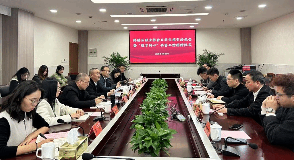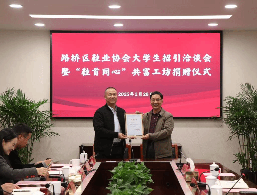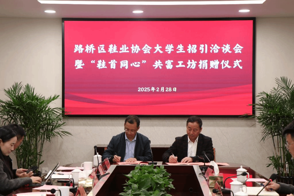 2月28日下午,路桥区鞋业协会大学生招引洽谈会暨“鞋首同心”共富工坊捐赠仪式在椒江校区行政楼第一会议室举行。校党委学工部部长杨启富、商学院党委书记马斌,路桥区委组织部部务会议成员潘泰柽,路桥区螺洋街道办事处组织委员李伟斌,路桥区鞋业协会会长戴明昌,“鞋首同心”共富工坊负责人李俊东出席活动,校学工部副部长王林军主持活动。