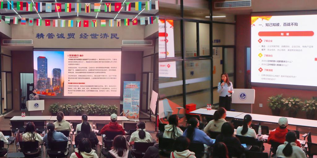 讲座中,平安银行校招生王心怡详细介绍了平安银行的发展战略、企业文化、社会责任及招聘岗位、流程和福利关怀等内容,并结合自身成长经历分享了职场心得。她表示,平安银行以打造“中国最卓越、全球领先的智能化零售银行”为目标,为应届生提供定制化培养、轮岗历练和导师辅导等全方位职业支持,助力每一位新人快速成长。她鼓励同学们勇于突破舒适圈,积极迎接挑战,在未来的职场中绽放光彩。