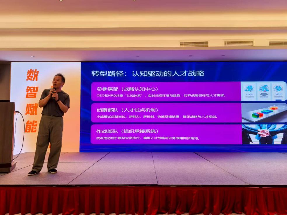 会上,台州学院商学院王呈斌教授以“数智时代战略人力资源管理挑战与应对”为主题作精彩报告。王呈斌教授开篇阐述数智时代背景,强调AI、大数据等技术迅猛发展,企业“战略×人力资源”体系需与数智时代紧密契合,以适应新的运行逻辑。通过对比数智时代与工业时代,王呈斌教授深入剖析了CEO面临的四大战略困境:环境变化加速、战略有效性减弱、执行力与KPI冲突凸显、预判能力存在缺陷。针对这些问题,他提出企业管理者应向CCO(首席认知官)转型,通过认知驱动的人才战略破局。同时,HRD需从传统的“人力管控者”转变为“认知驱动者”,发挥好CEO“认知翻译官”的作用。