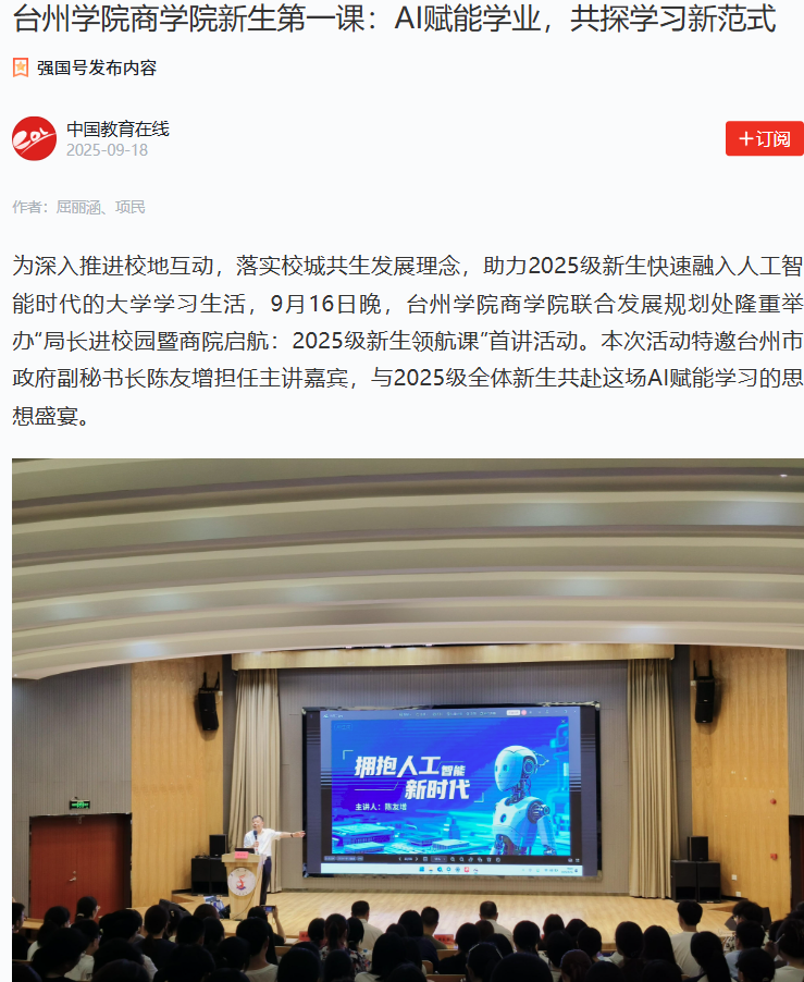 媒体聚焦|台州学院商学院新生第一课:AI赋能学业,共探学习新范式
