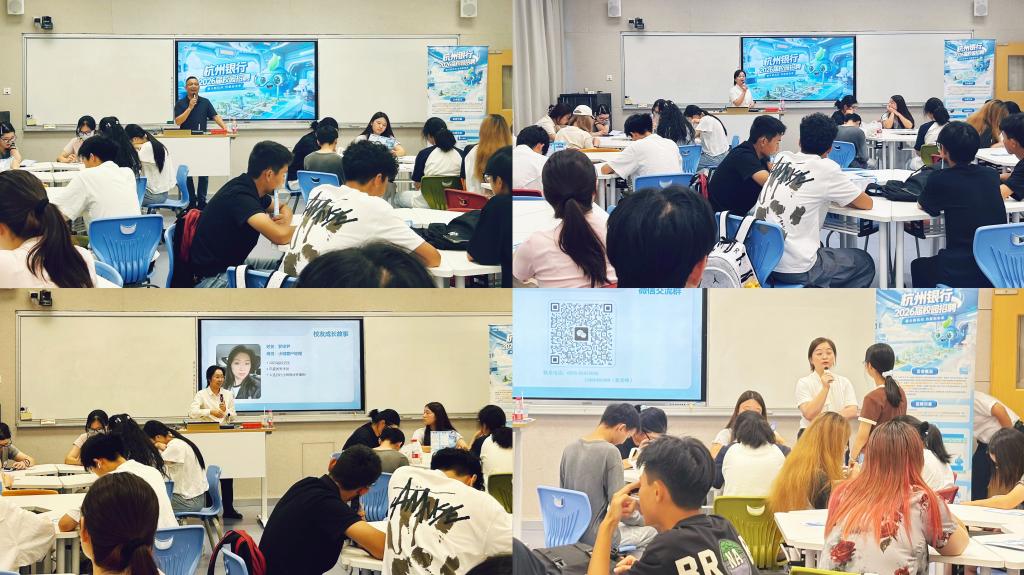 在“校友成长故事分享”环节,商学院2024届毕业生、杭州银行年度优秀学员罗梓尹结合自身投递简历与求职经历,分享了对银行业的理解与工作心得,建议学弟学妹把握秋招关键期,主动争取就业机会。2025届计算机专业校招生、优秀学员金敬颖则讲述了跨专业进入银行工作的心路历程,分享了在岗位中的成长体验与工作感悟,为同学们提供了跨领域求职的宝贵参考。