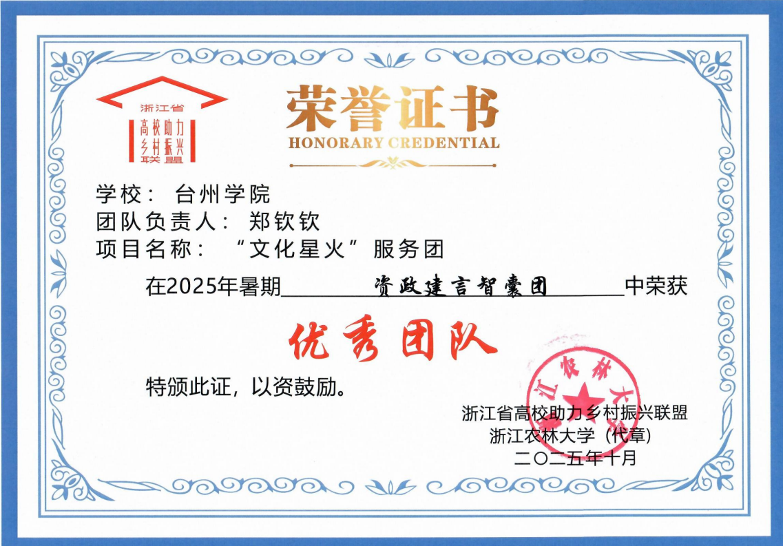 近日,从浙江省高校助力乡村振兴联盟传来喜讯,台州学院商学院“文化星火”服务团在2025年度评选中脱颖而出,荣获“浙江省高校暑期服务乡村振兴工作优秀团队”称号。这一荣誉是对商学院积极服务地方发展、深入践行乡村振兴战略的充分肯定。