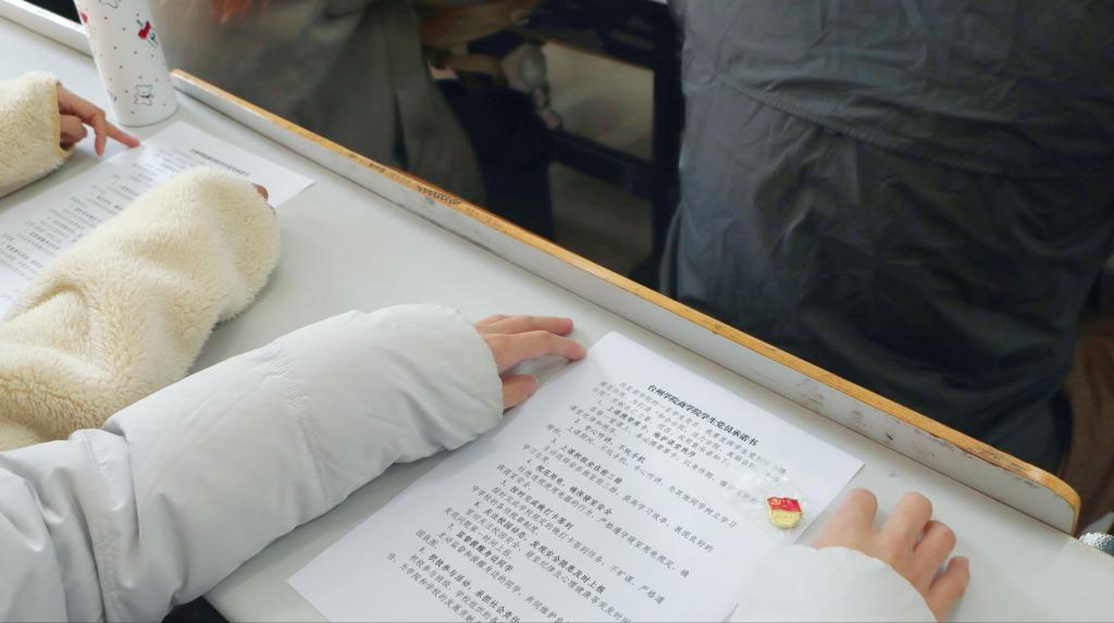 活动在雄壮的《国际歌》中拉开序幕,组织员吴佳妲领誓,新发展党员们举起右拳,庄严宣誓。“我志愿加入中国共产党,拥护党的纲领,遵守党的章程……为共产主义奋斗终身,随时准备为党和人民牺牲一切,永不叛党。”铿锵有力的誓言回荡现场,既是对党的忠诚承诺,也彰显了新时代青年党员砥砺奋进的决心。宣誓仪式后,为新发展党员佩戴党员徽章、发放党建学习教材,新发展党员郑重签署《学生党员承诺书》,鼓励大家要不断加强理论学习,以党员标准严格要求自己,在文明课堂、文明寝室建设中发挥先锋模范作用。