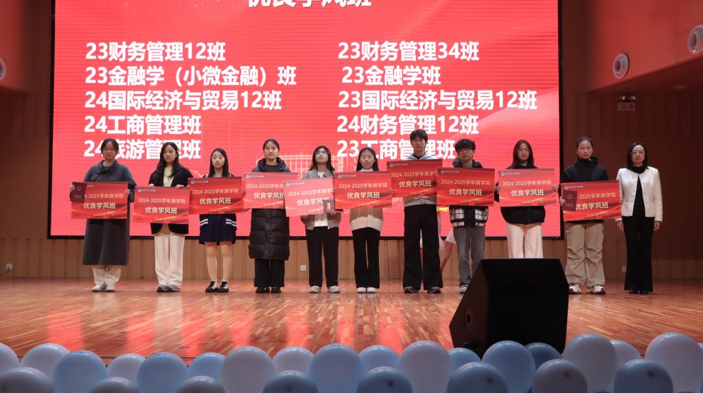 活动伊始,商学院依次为获得国家奖学金、浙江省政府奖学金、“三台”特等奖学金,校一等奖学金、优良学风班等奖项的个人和团队进行表彰,并宣读在创新创业、学科竞赛中获得国奖和省奖同学以及考取研究生、公务员等毕业生,激励更多同学不断追求卓越,勇攀高峰。