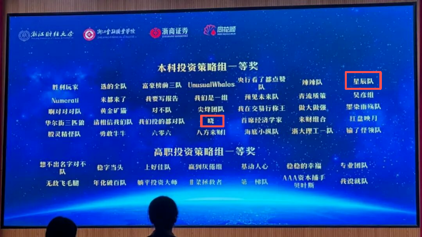本次比赛,我校从12个学院114支参赛队伍中选拔出25支参加省赛。商学院学子在学院领导的关心支持下,在老师的倾力指导下,怀揣着热情,精心准备,全力以赴。最终,经过多个环节的综合比拼,由蒋俊贤老师指导的星辰队(23金融殷鹏越、24金融专升本冯子昂、24金融张挺恺)和晓(23金融周婉彤、23金融范泽宇、23金融管天乐)获得投资策略组一等奖,由陈力扬老师指导的低调小队(24金融专升本尚佳乐、24金融专升李巧眉、23金融学厉新涛)获得投资策略组二等奖,由景刚老师指导的光之队(23金融王楠、23财管4班章雨、23国贸3班潘宁静)获得投资策略组二等奖。尤其值得一提的是,星辰队成功挤入全省前十,以全省第7名的成绩获得一等奖;晓队答辩成绩优秀,通过答辩名次前进了17名,获得一等奖,创造商学院学子在答辩环节的最好成绩。