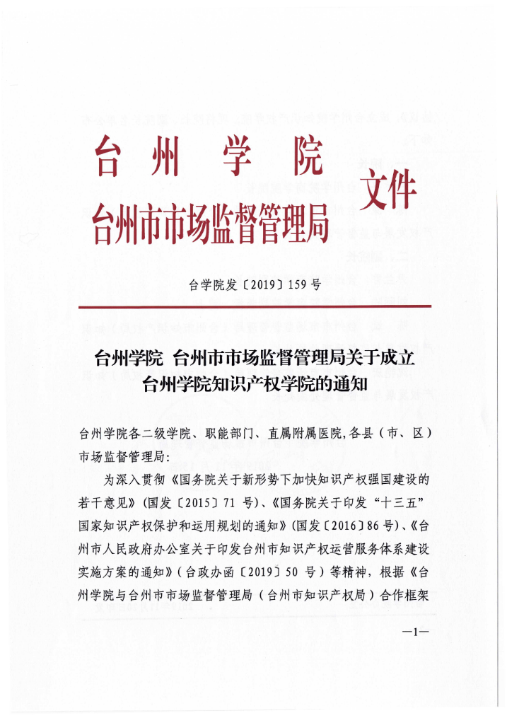 台州学院知识产权学院成立函文