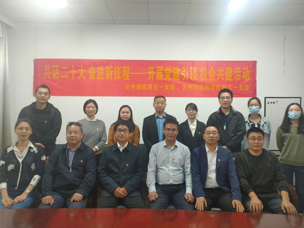 习近平总书记在二十大报告中强调,深入推进新时代党的建设新的伟大工程,同时强调,团结就是力量,团结才能胜利。为进一步落实新时代党的建设总要求,实现校企共建双方资源共享、深度联合,充分发挥社会力量在提升高校党建工作质量中的作用,积极引导和鼓励教师党员走向社会、职工党员走进高校,有效互动提升共建双方党员的幸福感和获得感,10月27日下午,商学院教师第一支部与台州城投联合一支部党建共建签约仪式在商学院三楼会议室举行。