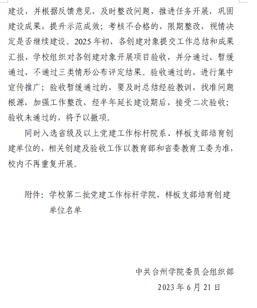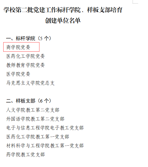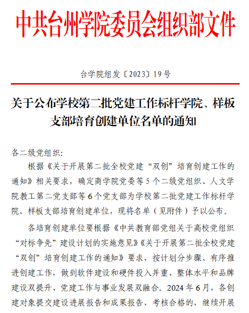 近日,中共台州学院委员会组织部公布了学校第二批党建工作标杆学院、样板支部培育创建单位名单。其中,商学院获批“校级党建工作标杆学院”培育创建单位。